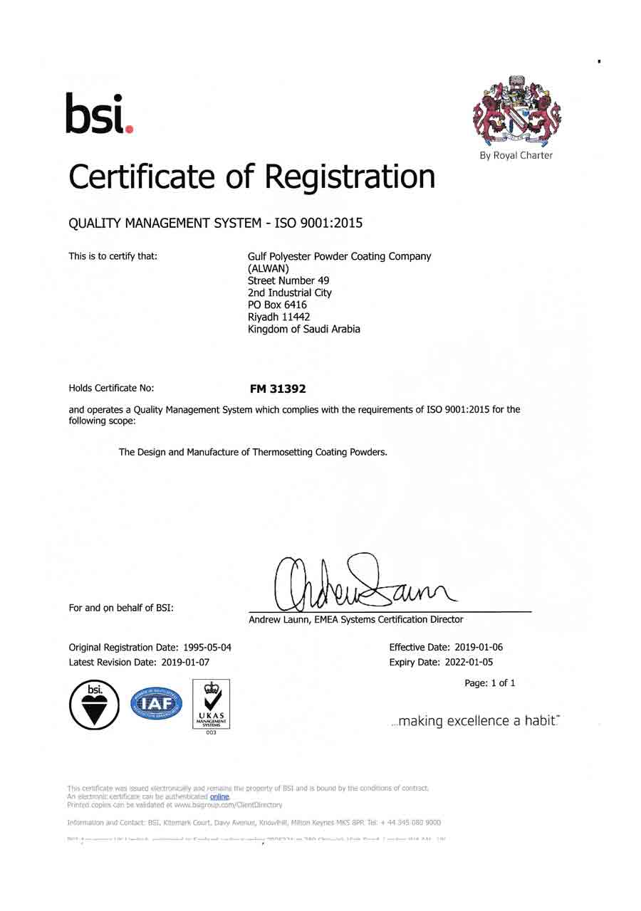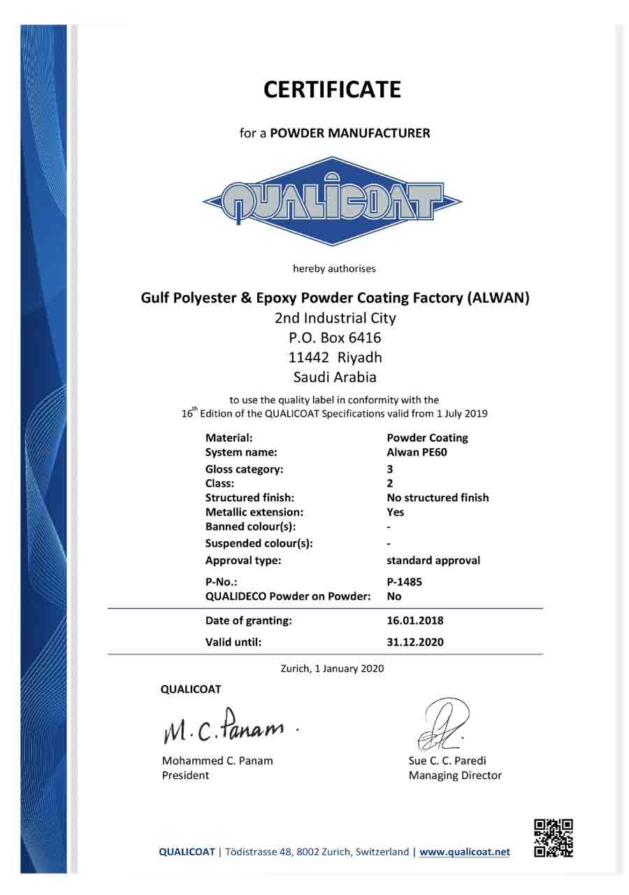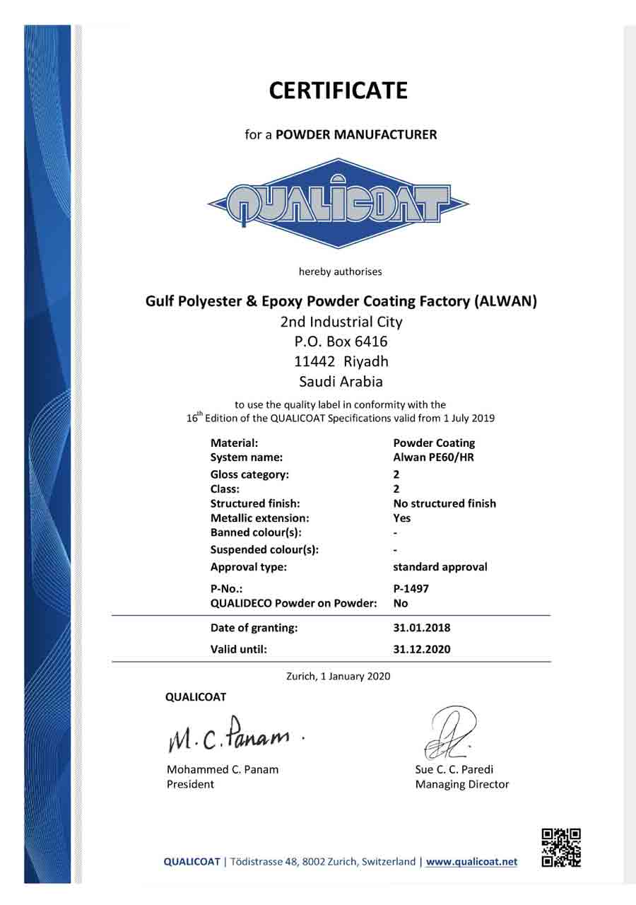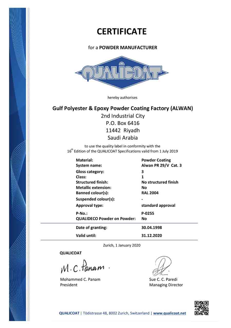 ALWAN has the ability to develop any customized colors and RAL system or according to customer’s samples for color matching. Our R & D department over look and ensure the consistent product quality supplied to our end user. Alwan is under license by Protech- oxyplast group of Canada who are considered one of the leading powder manufacturers in the world. We have been certified by Qualicoat and follow AAMA specification for the high standard products, we are also ISO 9001 certified.